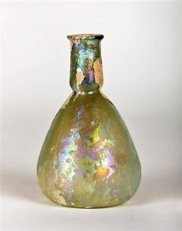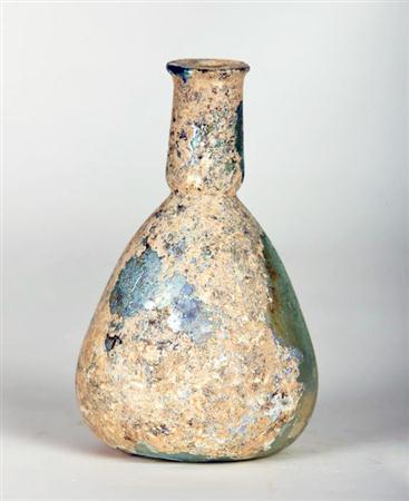 Rome, ca. 1st-3rd century AD/CE. Beautiful glass vessel with high iridescence; reverse has encrustation covering the under area; the globular body is elongated to a short neck, constricted between neck and body. Provenance: From a Florida collection formed in the 60s/70s.