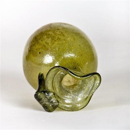 Rome, circa 1st-3rd century AD/CE. Olive-green glass pouring vessel with a single handle and trefoil lip; globular body has a concave base and a slight depression below handle with short neck; the wide strap handle would have been applied as a second step after the vessel was blown. Dimension: 5"H (13 cm)