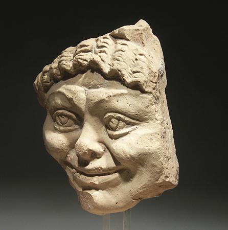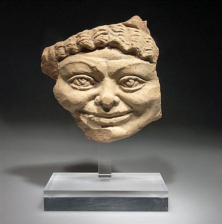 A splendid face of Medusa, with a broad smile to the mouth and pronounced dimples. Her round face is framed by fine wavy locks of hair. She has a short nose with large nostrils between protruding cheeks, with deep nasolabial folds. The large eyes have incised pupils and irises.