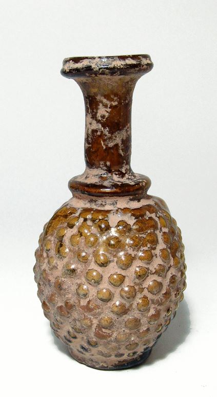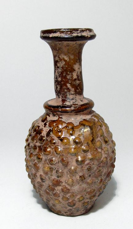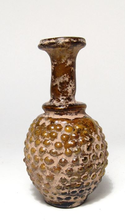 A Roman deep yellow glass grape flask, c. 2nd - 3rd Century AD, mold blown, the body in the form of a bunch of grapes sitting on a small disk foot, the neck is narrow with ring around the base, the flared mouth with collared rim. H: 5 1/8 in (14 cm). A nice example with deep golden yellow color, light iridescence and earthen deposits. Ex Los Angeles collection; Ex Jerusalem Gallery with copies of export documents.