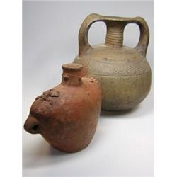 A Roman vase, the handles applied from the shoulders of the compressed spherical body to the rim of the narrow neck, the buff clay incised with chevron and combed bands, 20.5cm high and a terracotta vase with lug handles and lizards applied to the shoulders, 13.5cm high (2) £80-120