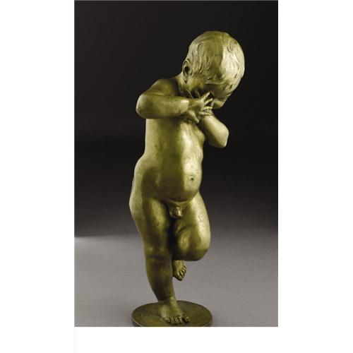 <B>Bronze Figure Of A Plump Cherub</B></I><BR><BR>Romano Romanelli (Italian, 1882-1958)<BR>Early to Mid Twentieth Century<BR>Bronze with gilt patina<BR>Marks: signed on base <I>Romano Romanelli</B></I><BR>26.5 high<BR><BR>The figure of a cherub balancing on one leg, his hands shielding the right side of his face, on a round base