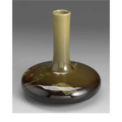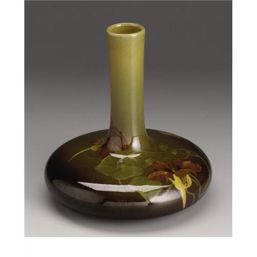 <B>An American Art Pottery Vase</B></I><BR><BR>Rookwood Pottery, Cincinnati, Ohio<BR>Painted by Irene Bishop<BR>1902<BR>Marks: (1902), (Rookwood), (artists signature)<BR>6 in. high<BR><BR>The brown and olive ground standard ware vase decorated with nasturtiums.<BR><BR>Provenance: From the collection of Rita and Richard Chouinard.