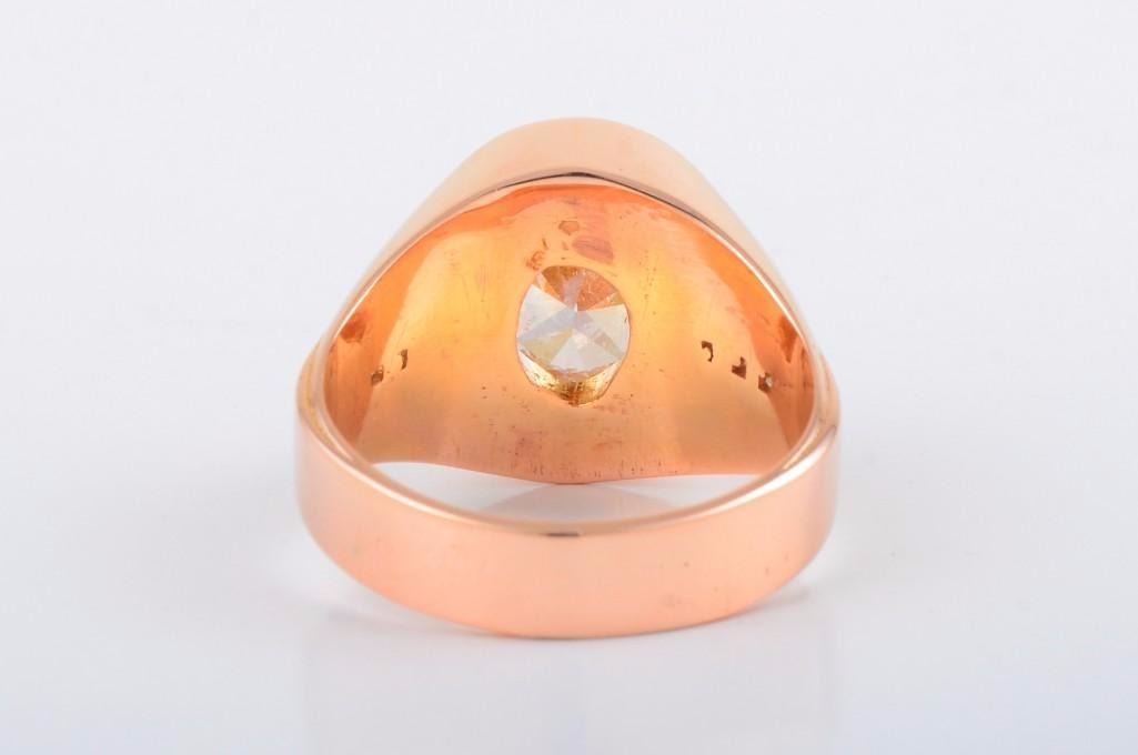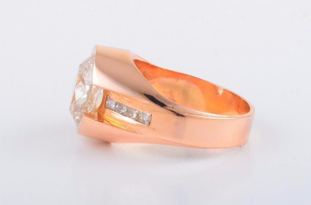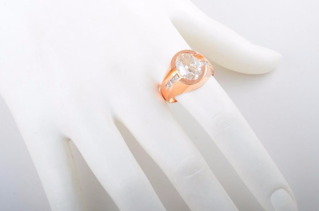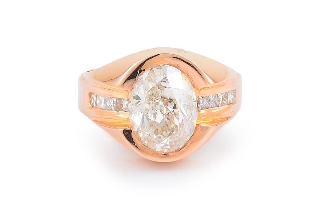 Centrally set with an oval-faceted diamond, weighing approximately 4.46 carats, with an estimated J-K color and I1-I2 clarity, flanked with 8 princess-cut diamonds on the shoulders, weighing approximately 0.75 carat, mounted in18K rose gold; ring size 10; totalweight 18.5g