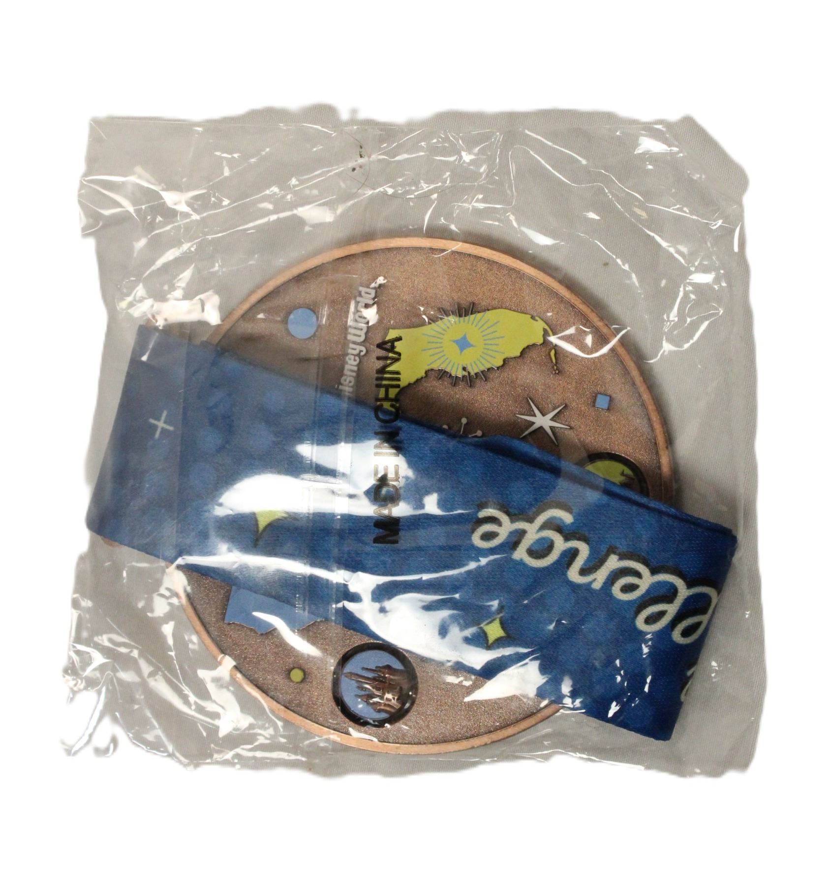 This round version of the 2024 runDisney Coast to Coast medal is given to those participants that complete at least a half marathon or greater at both Walt Disney World and Disneyland in the same calendar year. It features spinning circles with Mickey and Minnie on one side and the castles of each of the two parks on the other. The back has an image of each state with a star over the location of their respective parks.
