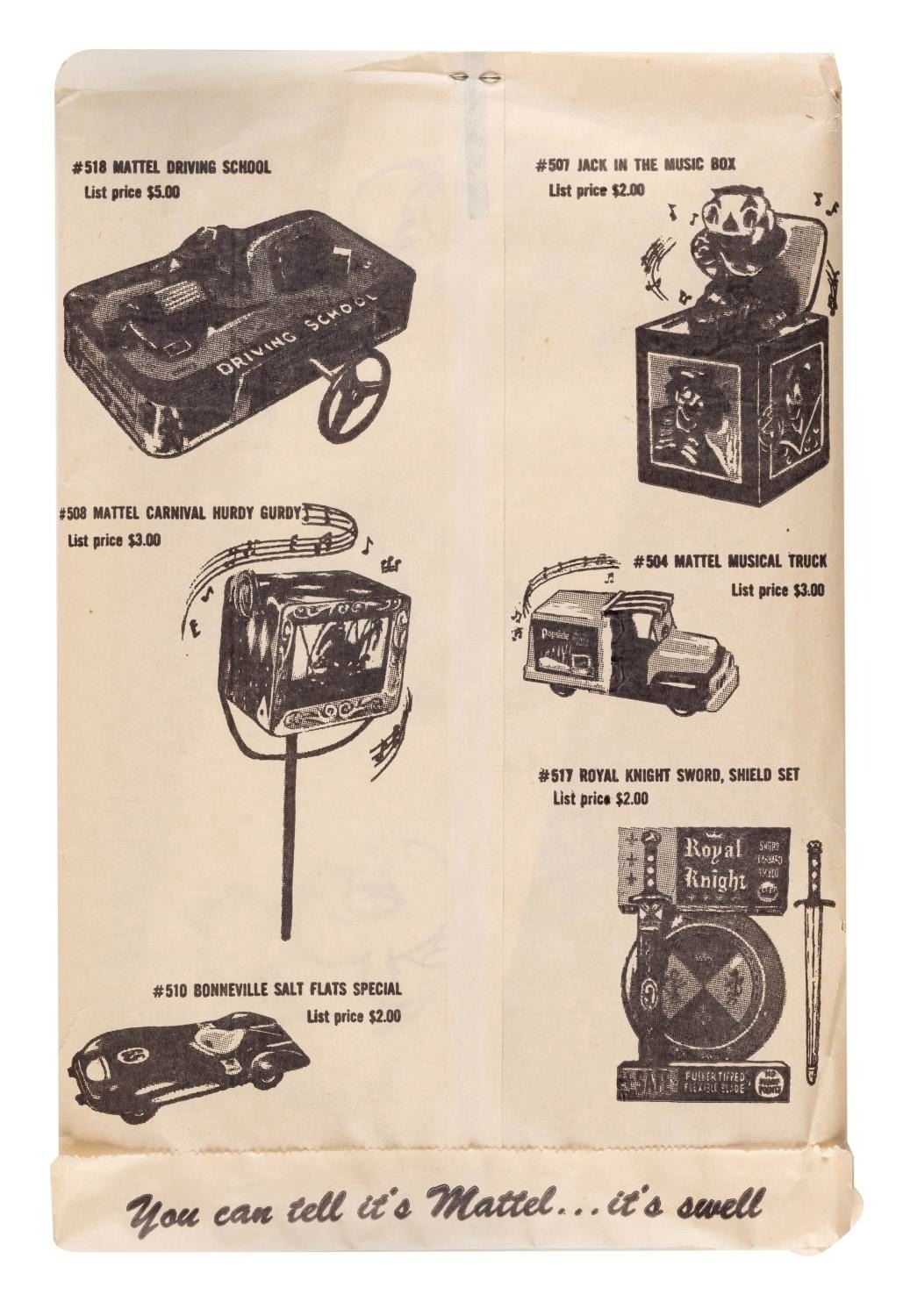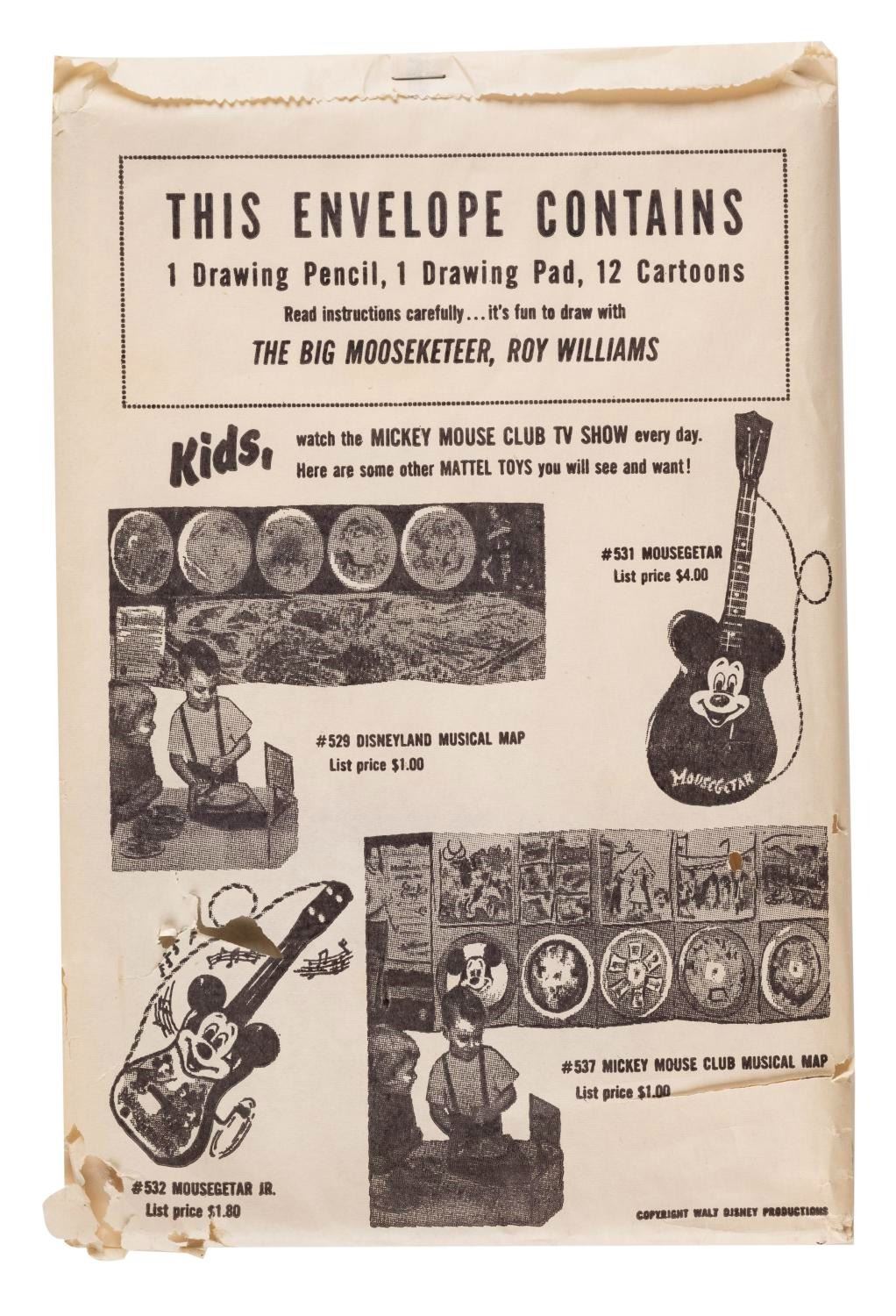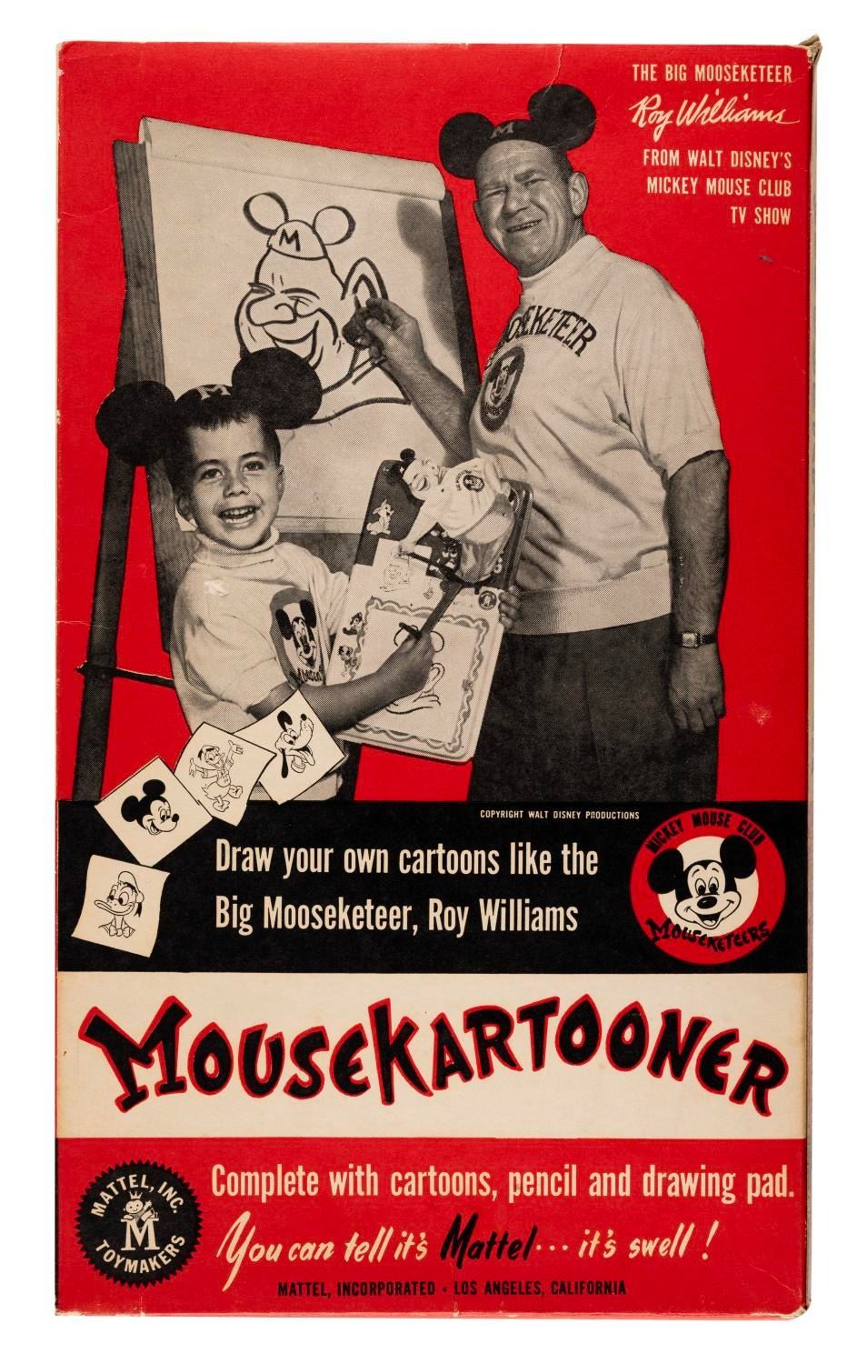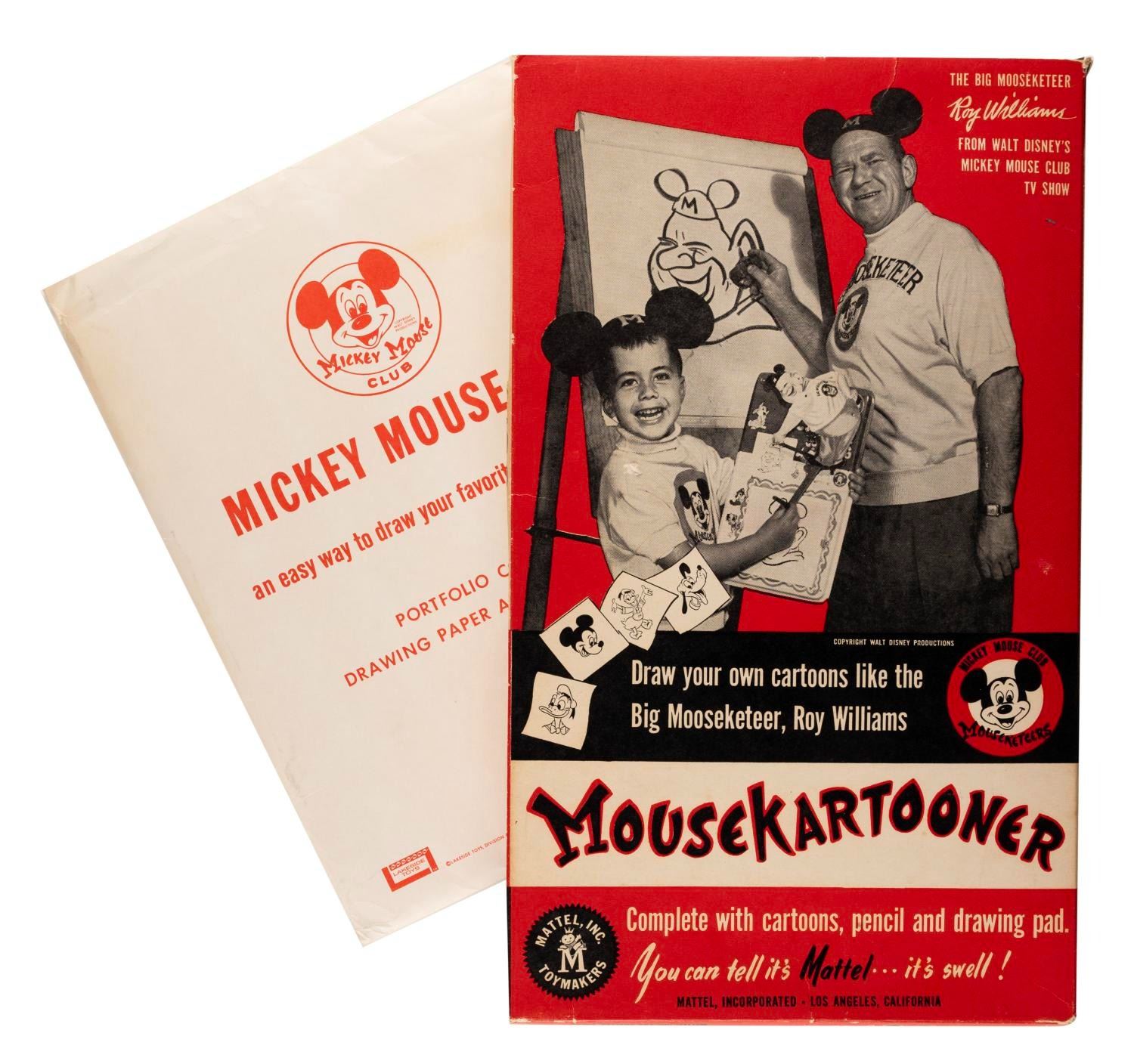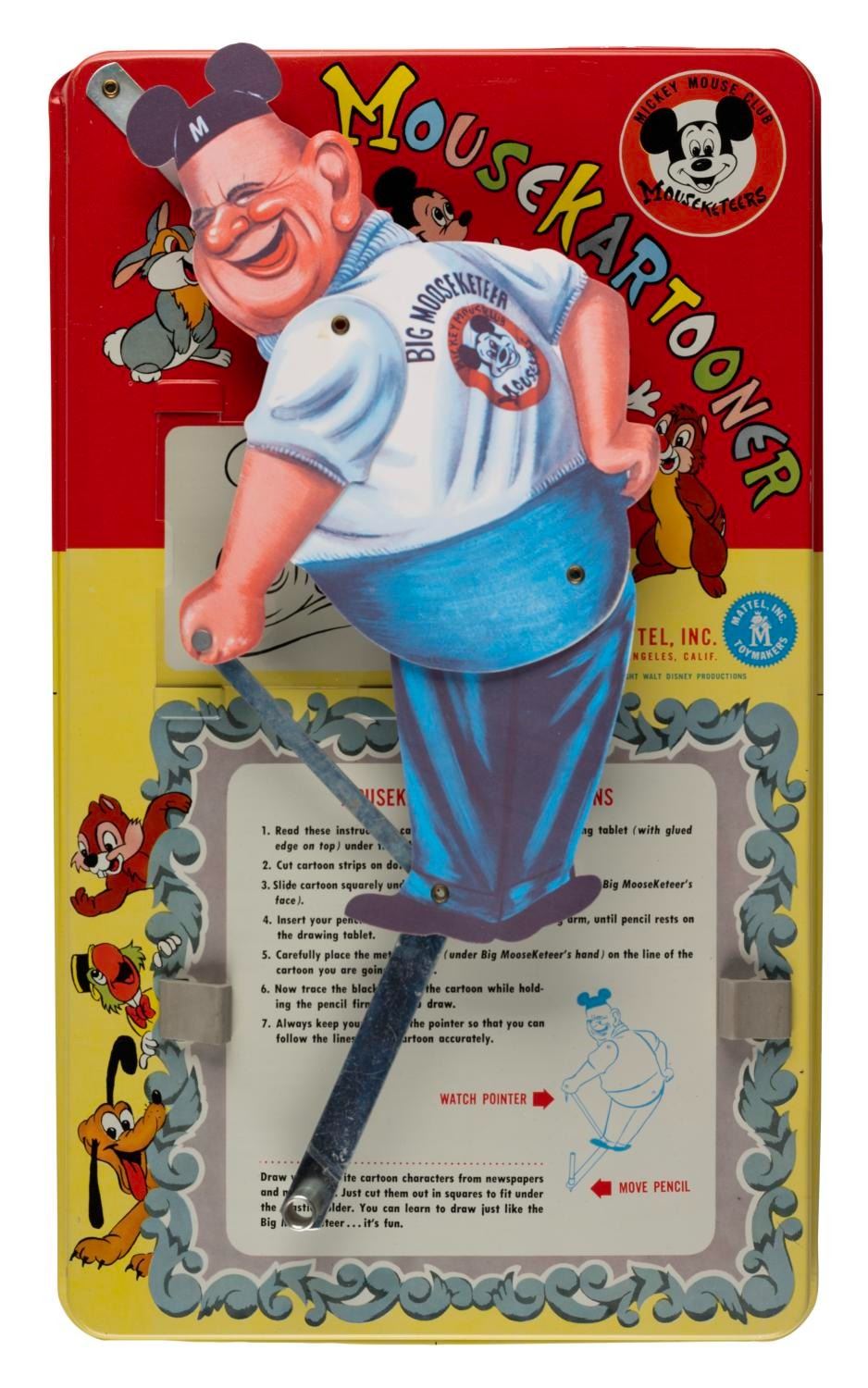 (Mattel, 1950s) A very rare vintage Mousekartooner pantograph drawing toy. Using a tin-litho tablet with an articulated arm, the "Big Mooseketeer" Roy Williams helps to trace any cartoon into a new drawing. Included are an unopened packet containing one drawing pencil, a pad, and twelve cartoons. The toy measures 8.5" x 14.5" x 0.75", the packet measures 6.5" x 10", and the items are in very good to good condition with light wear, oxidation to the metal arms, and corner wear, including some tearing on the packet of materials.