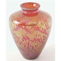 A Royal Brierley glass vase of high-shouldered form with bright iridescence against a red ground, engraved mark, 4in. £70-100
