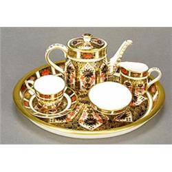 A Royal Crown Derby Solitaire miniature tea service, painted and gilt in the Imari palette, pattern number 1128, comprising; an oval tray, a teapot and cover, a milk jug, a sugar bowl and a teacup and saucer, iron-red printed marks, date code XLIV, last quarter 20th century (see illustration) £300-500