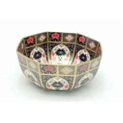 A Royal Crown Derby bone china fruit bowl, octagonal, painted with pattern 1128 in Imari colours, 8.5in. diam. £100-150