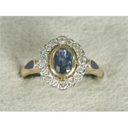 A Royal Doulton 14ct gold sapphire and diamond cluster ring with dark blue enamel set shoulders,...