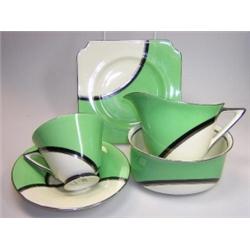 A Royal Doulton Art deco tea set, impressed dates circa 1936, decorated with the 'De Luxe' pattern each green piece divided by a black and silver arc to leave one third white, comprising: sandwich plate, sugar, milk, six teacups, saucers and tea plates (21) £150-200