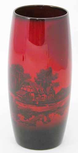 A Royal Doulton flambe vase, of elongated barrel form with printed view of a thatched roof cottage and surrounding landscape under the 'sang de boeuf' glaze, 9in. £50-70