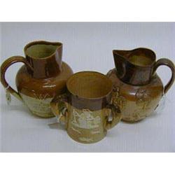 A Royal Doulton stoneware three-handled mug, together with a Doulton Lambeth stoneware Hunting jug and one other stoneware jug. (3) £40-60