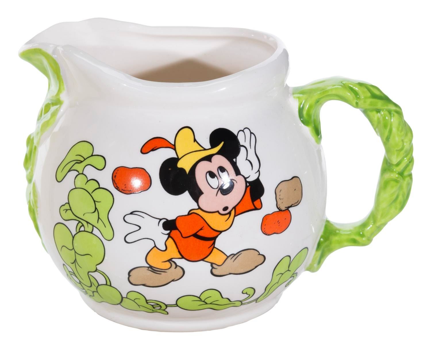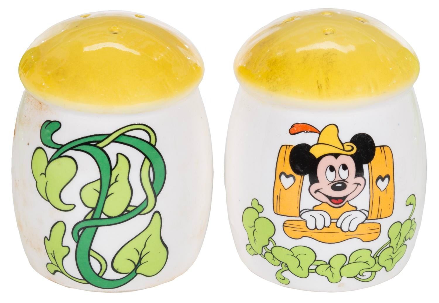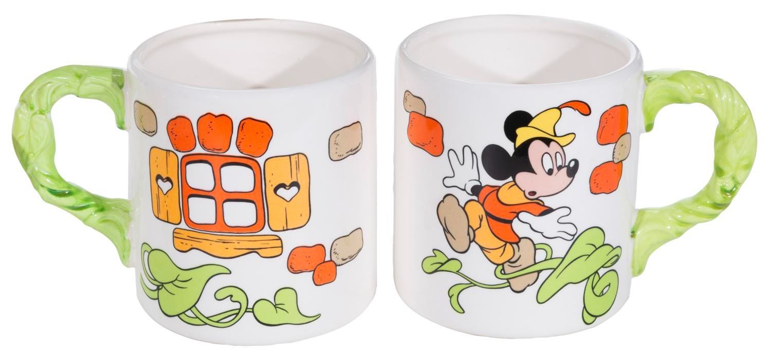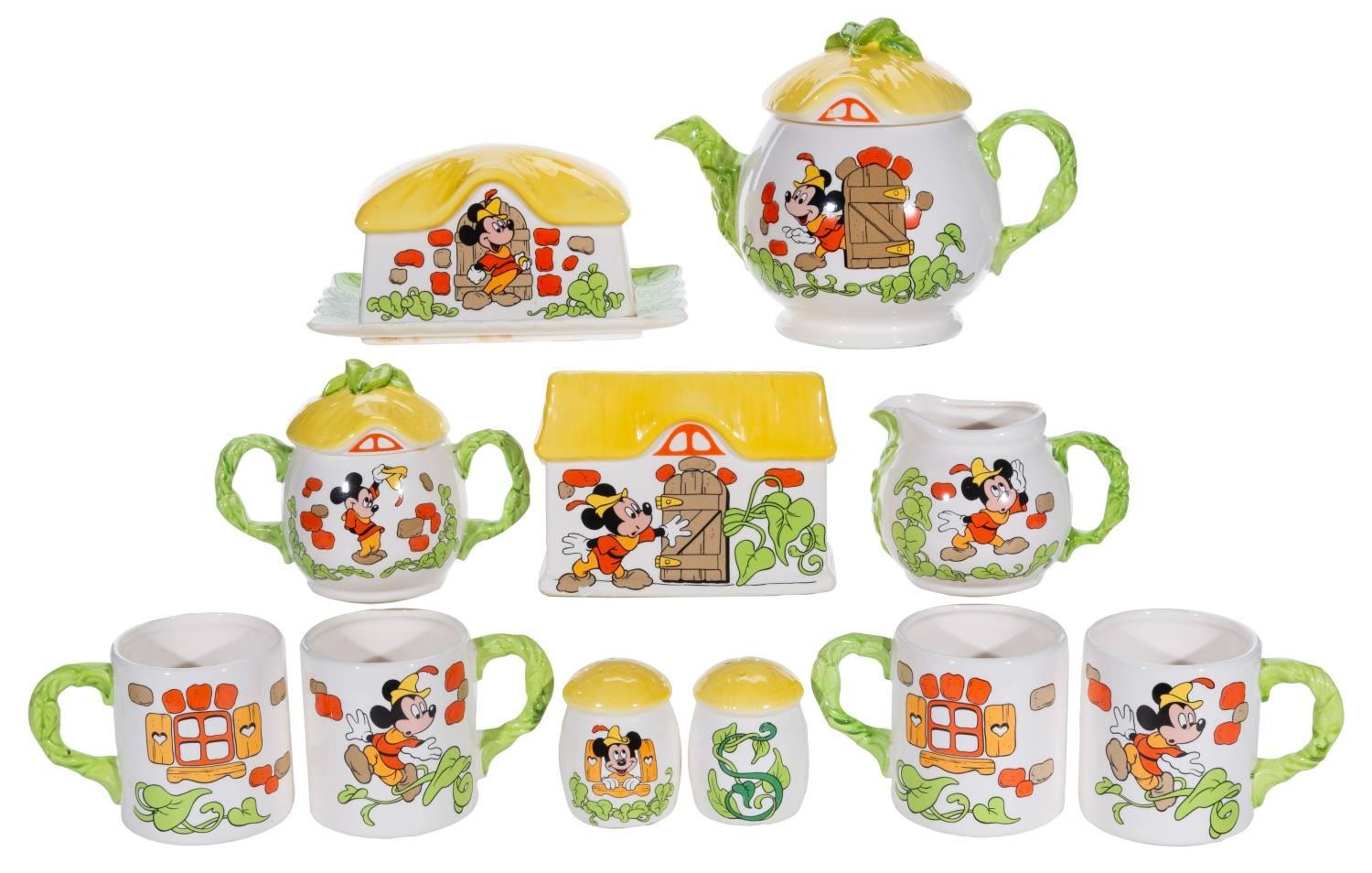 (Royal Orleans, 1980s) A set of Royal Orleans Mickey and the Beanstalk tableware. Included are four mugs, a teapot, salt and pepper shakers, a sugar bowl, a creamer, a napkin holder, and a butter dish. Measuring from the 2.25” diameter x 3.25” tall shakers to the 9” x 6” x 6.5” high teapot, the set is in very good to fine condition, with slight spotting to the lids of the sugar bowl and butter dish.