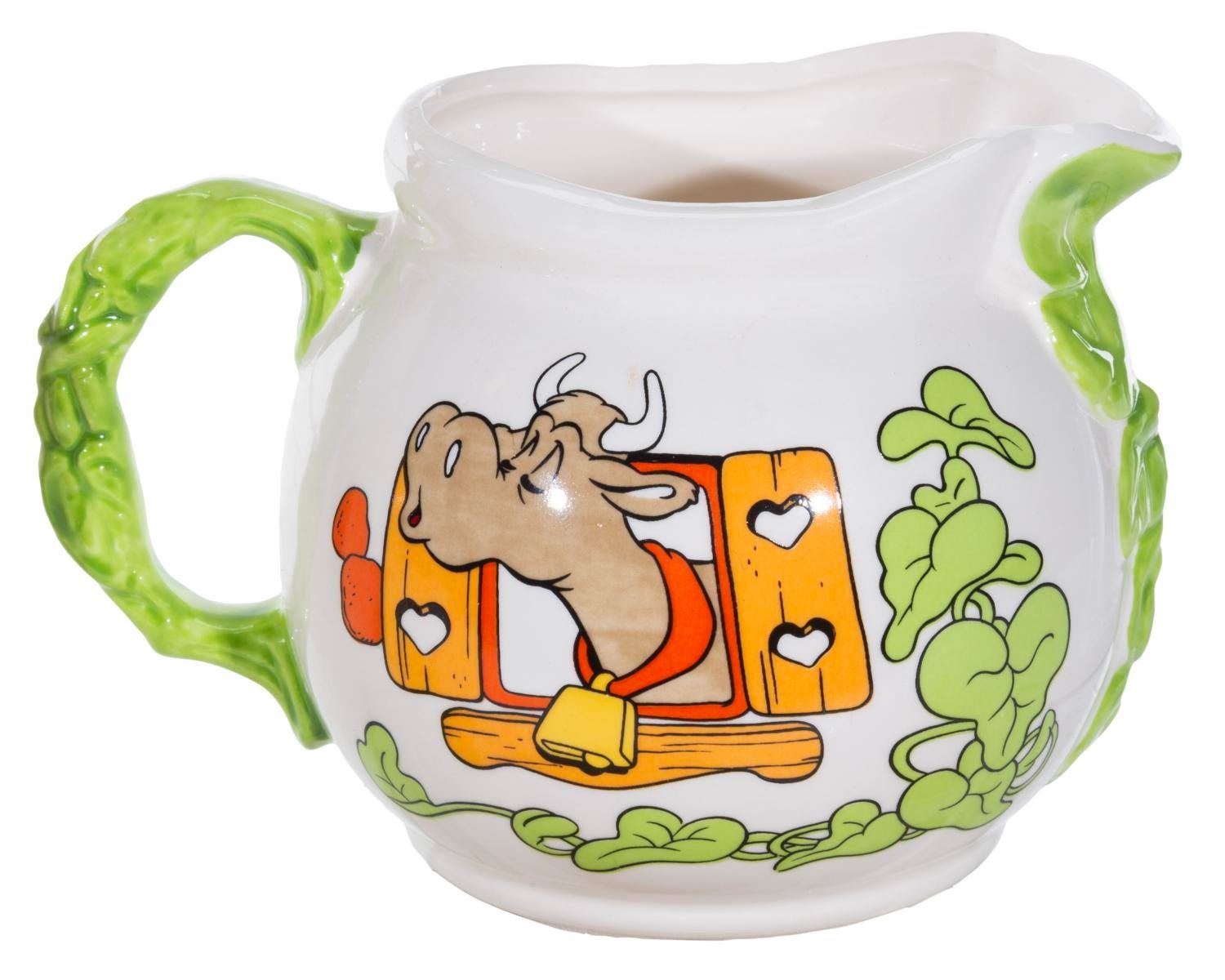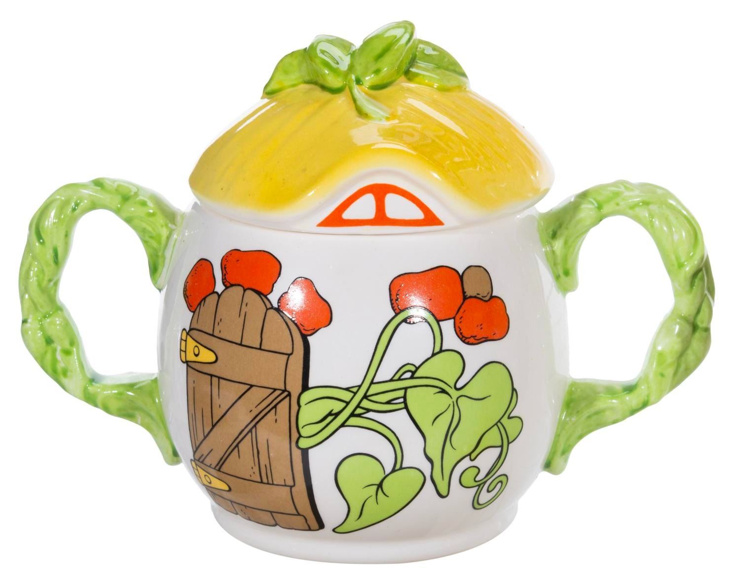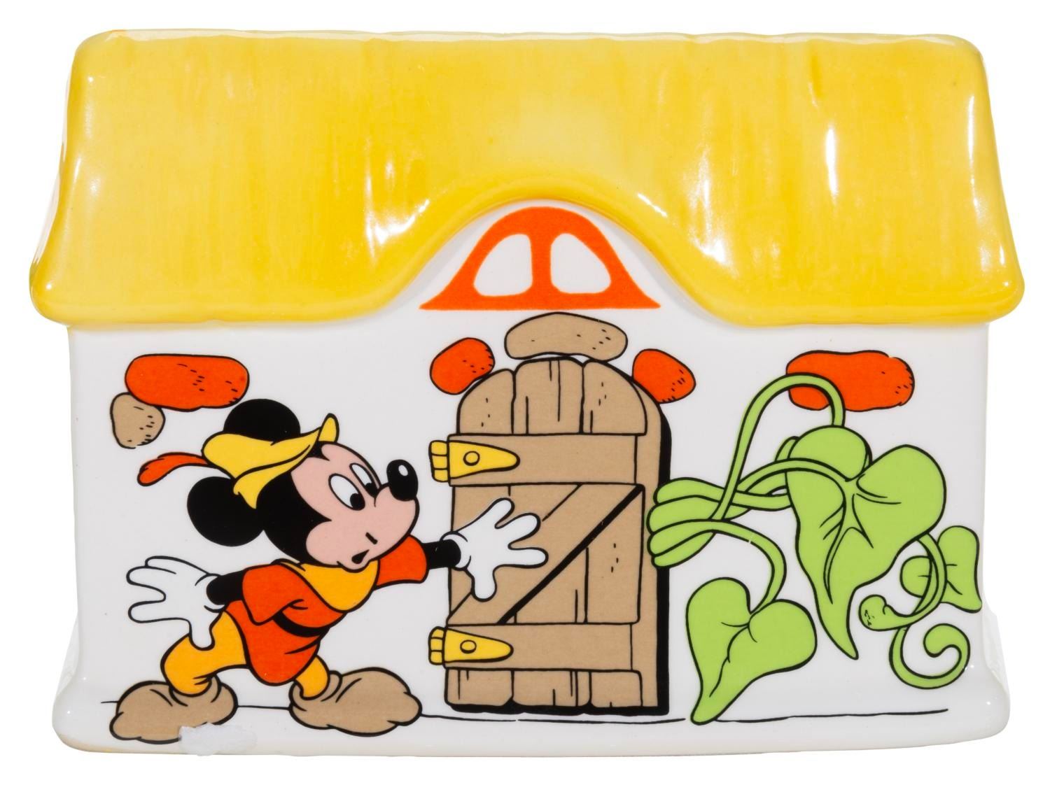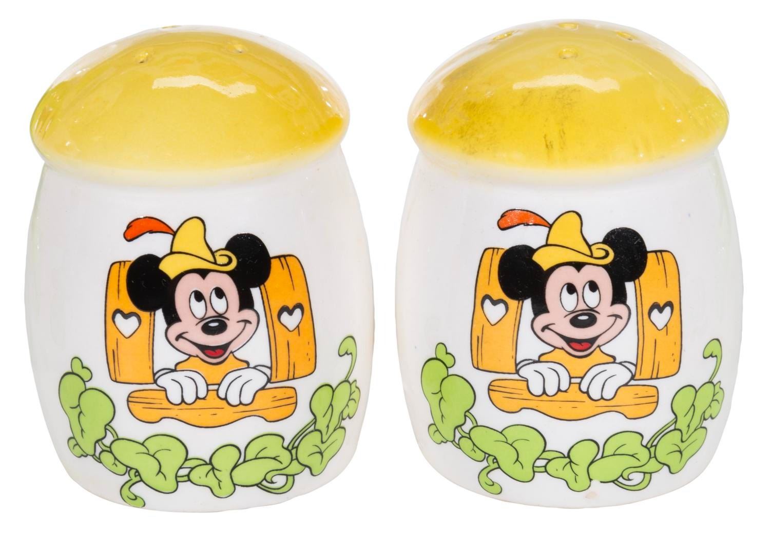 (Royal Orleans, 1980s) A set of Royal Orleans Mickey and the Beanstalk tableware. Included are four mugs, a teapot, salt and pepper shakers, a sugar bowl, a creamer, a napkin holder, and a butter dish. Measuring from the 2.25” diameter x 3.25” tall shakers to the 9” x 6” x 6.5” high teapot, the set is in very good to fine condition, with slight spotting to the lids of the sugar bowl and butter dish.