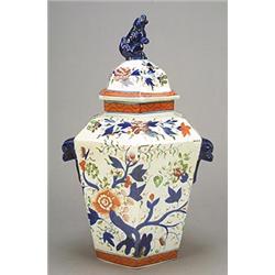 A 'Royal Stone China' covered vase by Ralph Stevenson & Williams, of tapered hexagonal shape with dog handles, the domed cover with seated dog finial, decorated with a typical Japan pattern, overall height 40.7cm, red-printed royal arms mark with maker's initials, circa 1825 (some enamel flaking on body, cover holed and chipped) (see illustration) £100-150