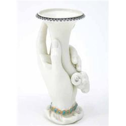 A Royal Worcester 'hand' vase, the hand holding a tapering vase with ram's head terminal, date code 1865, 6in. £80-120