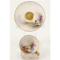 A Royal Worcester miniature teacup and saucer finely painted with sheep and surrounding foliage,...