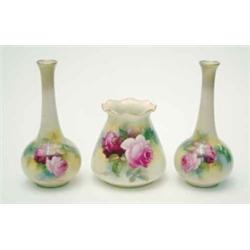 A Royal Worcester posy vase, painted with red roses and leaves by M.Hunt, date code 1926, 3.25ins and a pair of globe-and-shaft posy vases, similarly painted, unsigned, date code 1924, 5.25ins £200-250