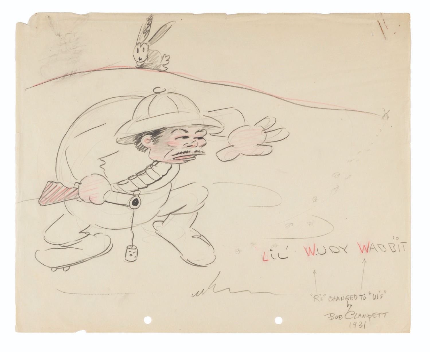 (Clampett, 1931) A gag drawing of Rudy Ising hunting for Oswald the Lucky Rabbit by Bob Clampett. This drawing appears in the 1975 “Bugs Bunny: Superstar” documentary as Clampett describes drawing lots of “wascally wabbits” outsmarting hunters in his early days at the Warner Bros. Studio. Drawn several years before the creation of Bugs Bunny and Elmer Fudd, the drawing represents the first use of the “W” speech and the theme of rabbit hunting, both of which would become staples of the Warner Bros. cartoons. Clampett signed the graphite and colored pencil drawing in the bottom right corner. With an image size of 8” x 8.5” on 9.5” x 12” animation paper, the drawing is in good condition with edge tears, smudges from handling, scuffs, and pinholes at the corner from display.