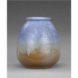 A Ruskin pottery ovoid vase, with matt blue pitted glaze over a mottled brown ground, 5.5in high, impressed marks