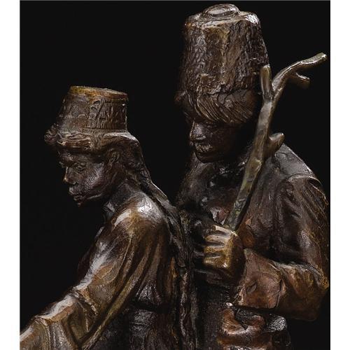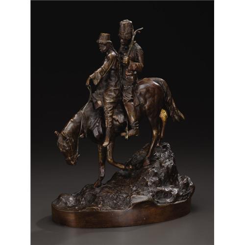 <B>A Russian Bronze Sculptural Group</B></I><BR><BR>A.M. Bonegor, Russian<BR>Early 20th Century<BR>Bronze with Brown Patina<BR>Signed: <I>A.M. Bonegor</B></I><BR>10.25 inches x 5 inches x 7.75 inches<BR><BR>Finely cast Russian bronze with two cossacks on horseback<BR><BR>Private Collection, Dallas <B>Condition Report:</B> Overall good condition with reins replaced<BR><BR><b>Shipping:</b> Requires 3rd Party Shipping (<a target="_blank" href="http://www.heritageauctions.com/common/shipping.php">view shipping information</a>)