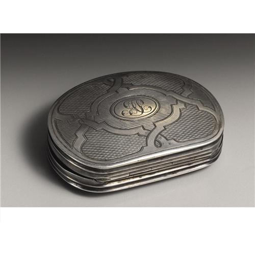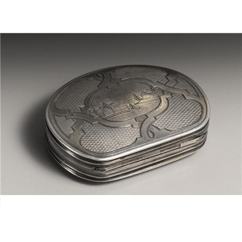 <B>A Russian Silver Snuff Box</B></I><BR><BR>Mikhail Vasibevich, Moscow, Russia<BR>Circa 1890-1900<BR>Silver<BR>Marks: <I>84</B></I> (star), <I>MM</B></I><BR>2.75 in. long, 1.91 troy ounces<BR><BR>Of semi-circular form with machine turned decoration within intersecting bands, reserved cartouche with engraved view of a village, the bottom with oval reserve monogrammed <I>AP</B></I>.<BR> <BR><BR><B>Important notic