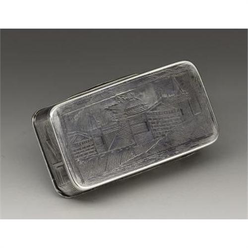 <B>A Russian Silver Snuff Box</B></I><BR><BR>Unknown maker, Moscow, Russia<BR>1836<BR>Silver<BR>Marks: (assay mark of Nikolai Lukich Dubrovin), (Moscow), <I>1836, 84, OB</B></I> (in Cyrillic)<BR>2.25 in. long, 1.55 troy ounces<BR><BR>Of rectangular form, the top and bottom engraved with cityscapes within border, the sides with engraved geometric decoration.<BR><BR><BR><b>Shipping:</b> Requires 3rd Party Shipping (<a target="_blank" href="http://www.heritageauctions.com/common/shipping.php">view shipping information</a>)