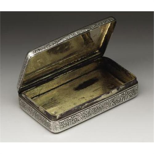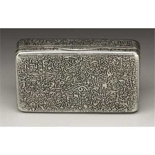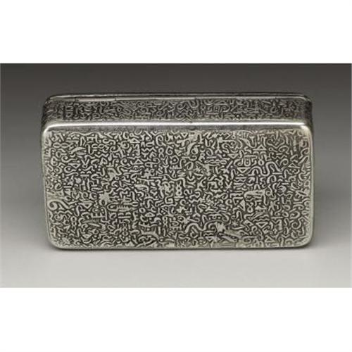 <B>A Russian Silver Snuff Box</B></I><BR><BR>Karl Verlin, St. Petersburg, Russia<BR>Circa 1880<BR>Silver and silver gilt<BR>Marks: (St. Petersburg), <I>84, KV</B></I> (in Cyrillic)<BR>2.81 in. long, 2.37 troy ounces<BR><BR>Of rectangular form with all over abstracted hieroglyphic decoration. Silver gilt interior.<BR><BR><BR><b>Shipping:</b> Requires 3rd Party Shipping (<a target="_blank" href="http://www.heritageauctions.com/common/shipping.php">view shipping information</a>)