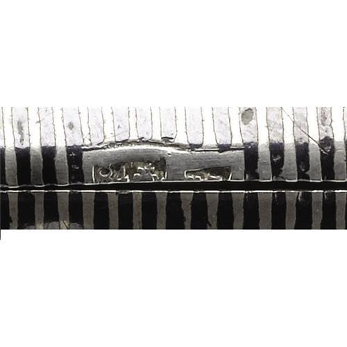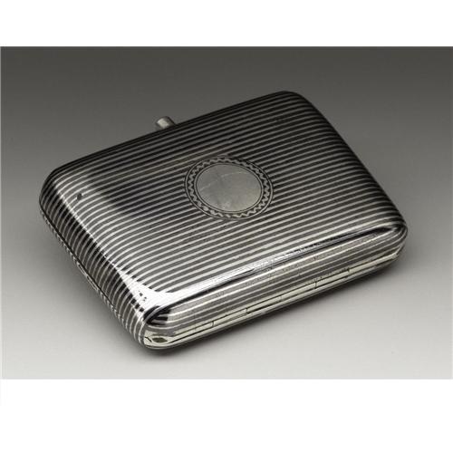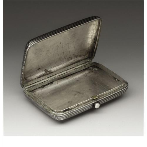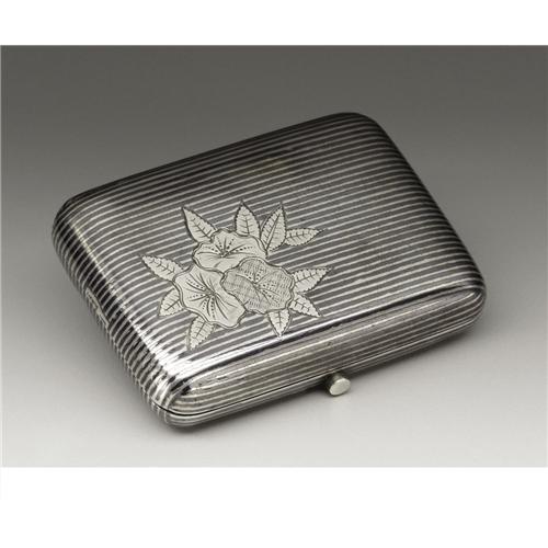 <B>A Russian Silver and Niello Snuff Box</B></I><BR><BR>Unknown maker, Russia<BR>Late Nineteenth Century<BR>Silver and niello<BR>Marks: <I>84</B></I><BR>2.75 in. long<BR><BR>Of rectangular cushion form with alternating bands of silver and niello, the top with etched floral spray, the bottom with circular reserve.<BR>