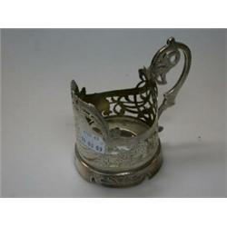 A Russian silver glass holder, marked for 1908/1917, of pierced circular form, scroll engraved and with a pierced scroll handle, 10.5cm, 4.25oz £40-60