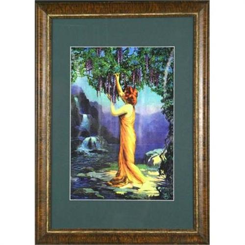 ?Girl with Flowers? has a classical feel to it, almost as if it were to be of the roman goddess Floral in the beautiful print. Sunlight shimmers off the trees leaves, as it radiates off the girls dress as she tends to the purple flowers of the tree. This very masterfully painted piece is complimented by a mahogany toned birch marked frame, that is decorated by a gold cord that adds a beauty to the print all its own. It is matted in a dark green mat and underlined in white, which captures the cool colors of the print. The painting measures a total of 22.5? x 16.25?. The use of atmospheric perspective in this print, bring a unity to this an excellent composition. Signed in the bottom right corner, this print would be a great addition to any art enthusiast?s collection and is remarkably priced.