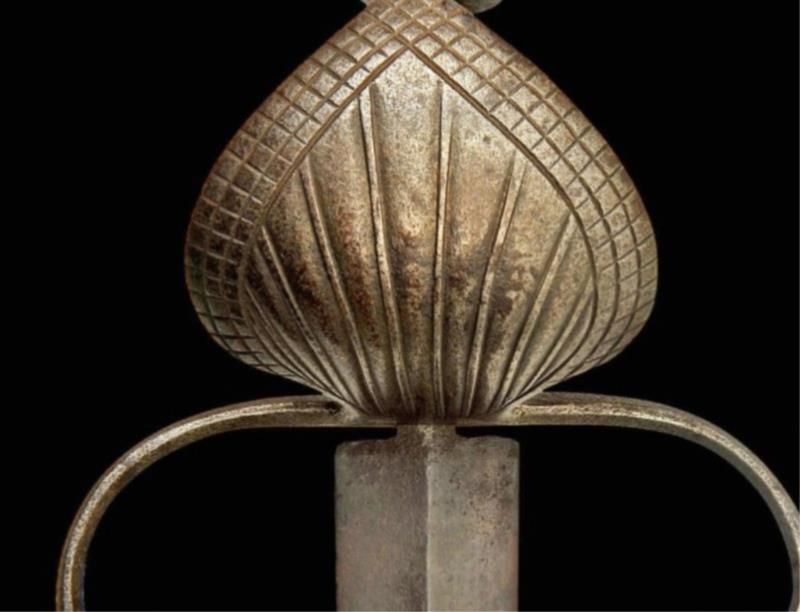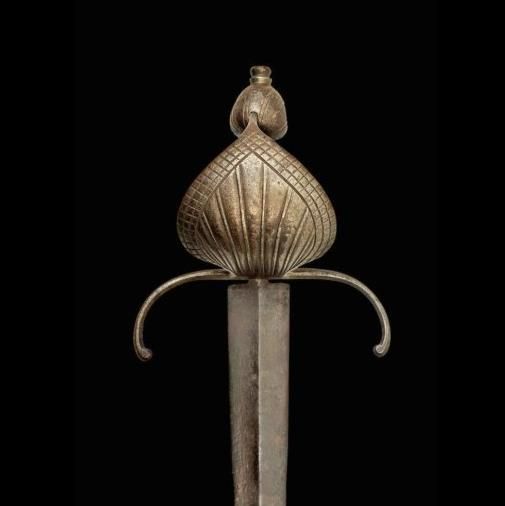 A SAILGUARD SWORD Northern Italy, Venetian Republic, late 1500?s With robust rapier blade of diamond section, faceted quillons turned downwards, cannelured triangular guard chequered at the edges, fig-shaped pommel that is also grooved with filleting