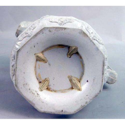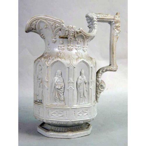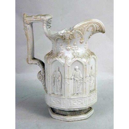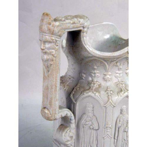 A SALT-GLAZED PITCHER<BR><BR>in the "Apostles" pattern. Cracked, repaired, staining. 10"h