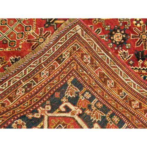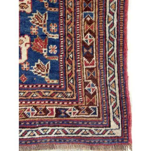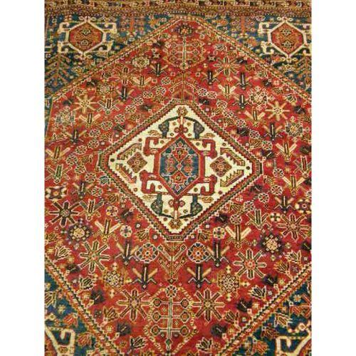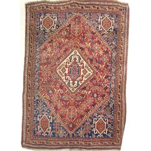 A SAROUK CARPET<BR><BR>With geometric medallion on ivory field, and burgundy and blue surrounds, 6`10"h x 5`w