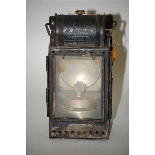 A. SARTORIUS-WUPPERTAL CARRIAGE LANTERN #1961 - BLACK PAINTED SHEET METAL LANTERN W/ SPRING MOUNTED DOORS, LAVENDER SIDE PANELS & NICKEL PLATED BURNER, REFLECTOR & BAIL HANDLE (8 1/4" T W/O HANDLE)-WEAR, MISSING BRACKET HOOK, PAINT LOSS, IMPERFECTIONS