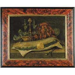 Lot 1400 A. SAUVAGE (French, 19th Century) SEAFOOD FEAST. Chromolithograph on canvas scene shows fish, crayfish and condiments on a table setting. Ready to serve. Housed in a painted molded wood frame with gold liner. SIZE: 15-1/2” x 20”. CONDITION: Some cracking, good. 9-95445 (200-400)