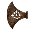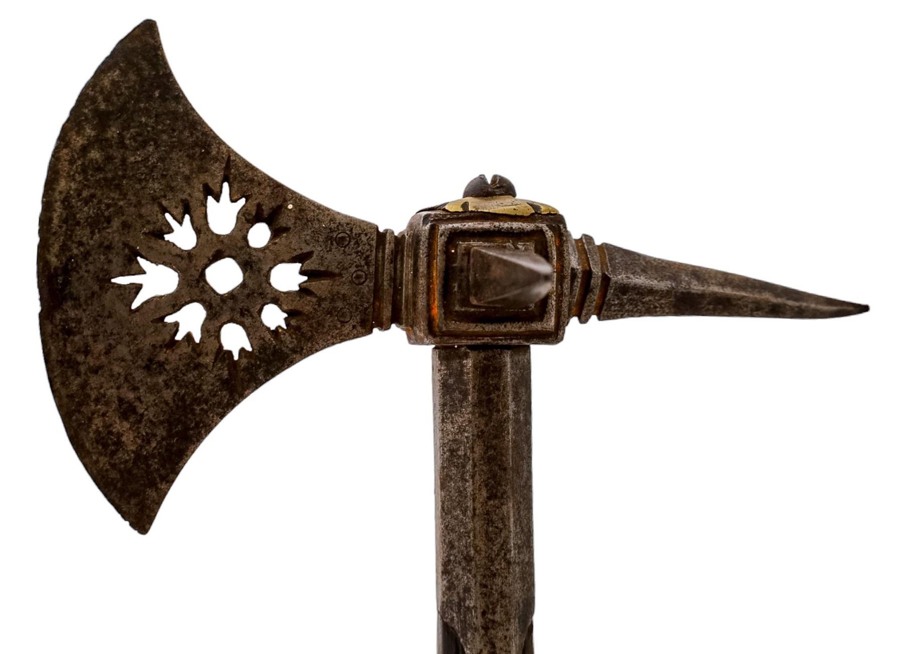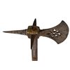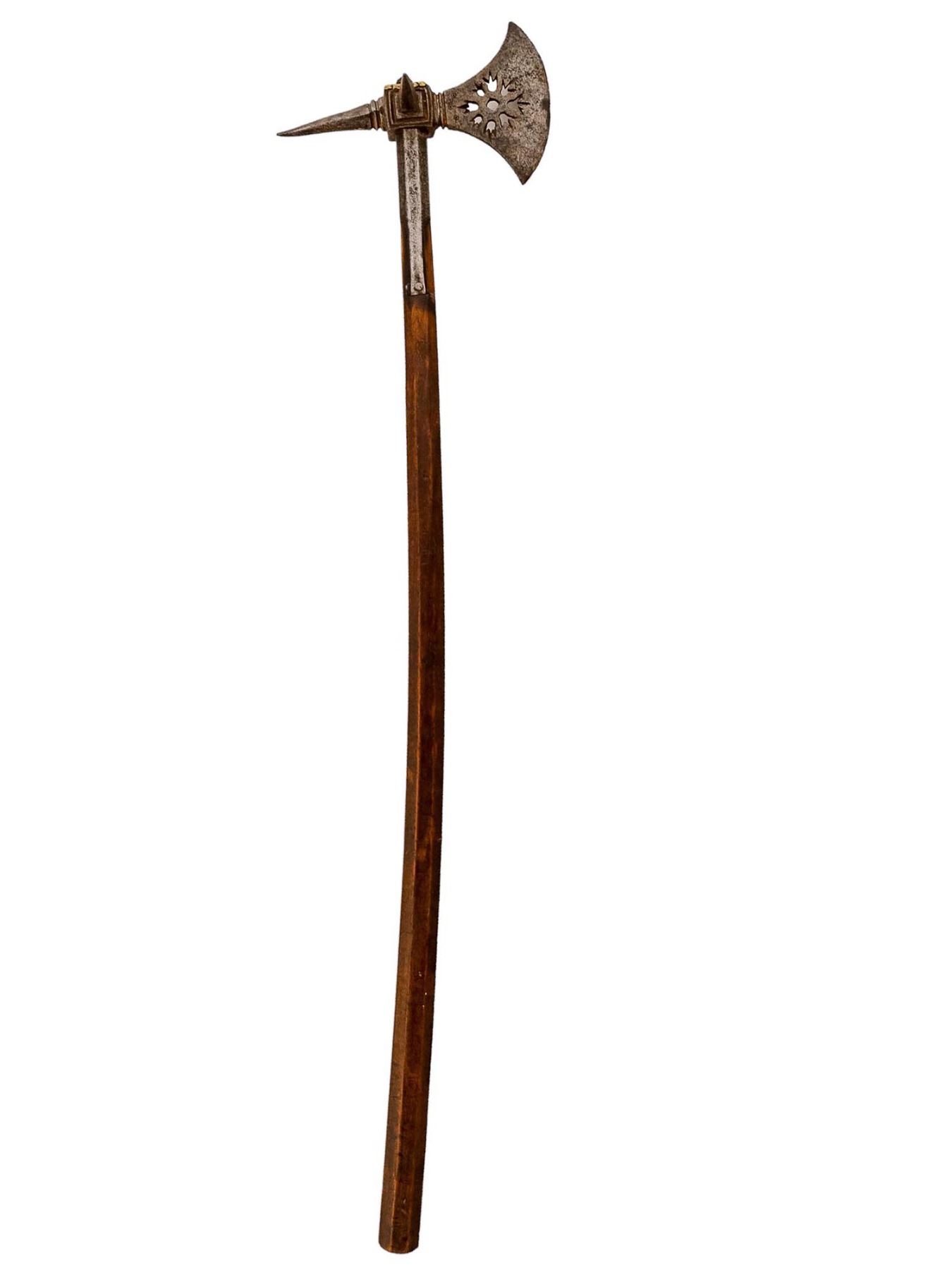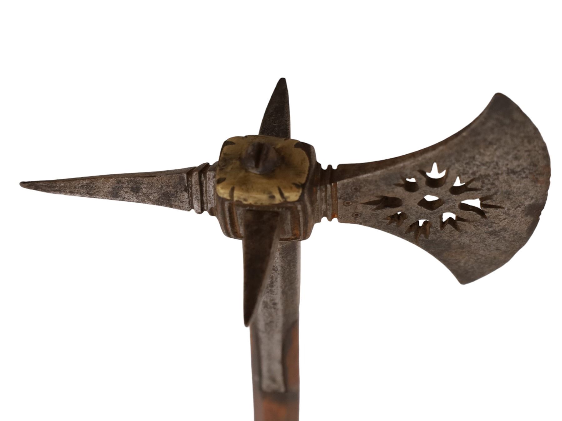 With a pierced axe blade and faceted back and side spikes. Plain-bordered sockets. Wooden faceted shaft.