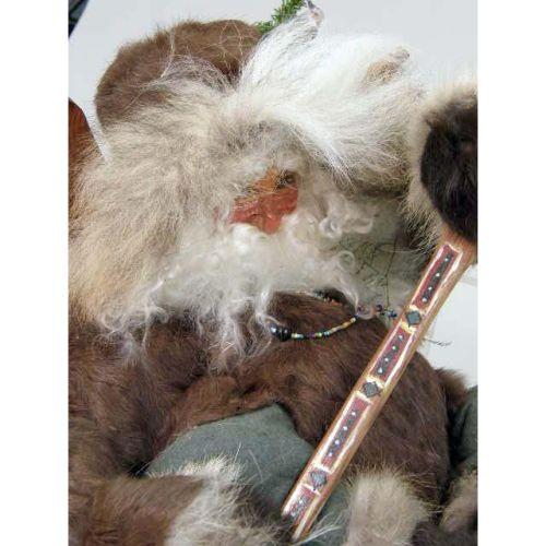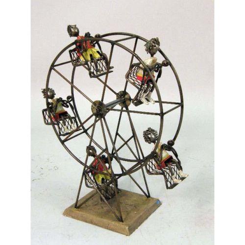 A SCULPTURAL METAL FERRIS WHEEL AND RIDERS<BR><BR>Mexico. Together with a "Cowboy Christmas" wall plaque and a large "Eskimo Santa" doll in a birchbark canoe, signed "Nikki," Ferris wheel: 21-1/2"h x 13-1/2"w x 8"d. 3 pieces