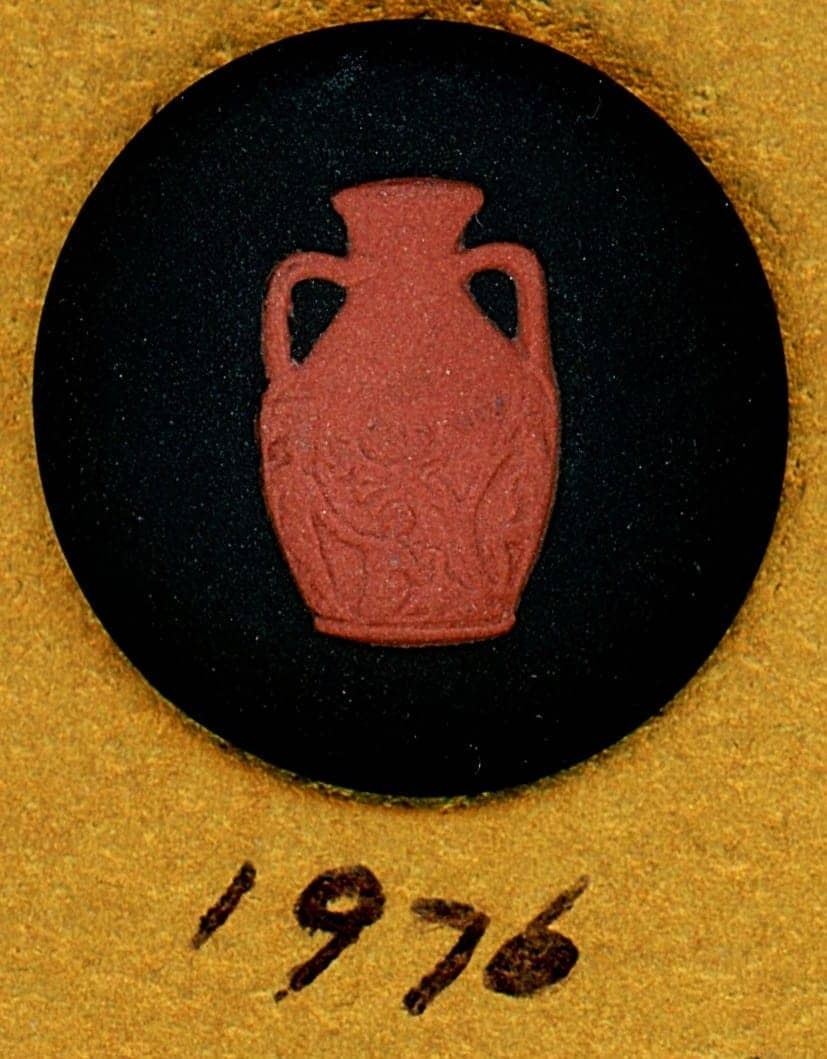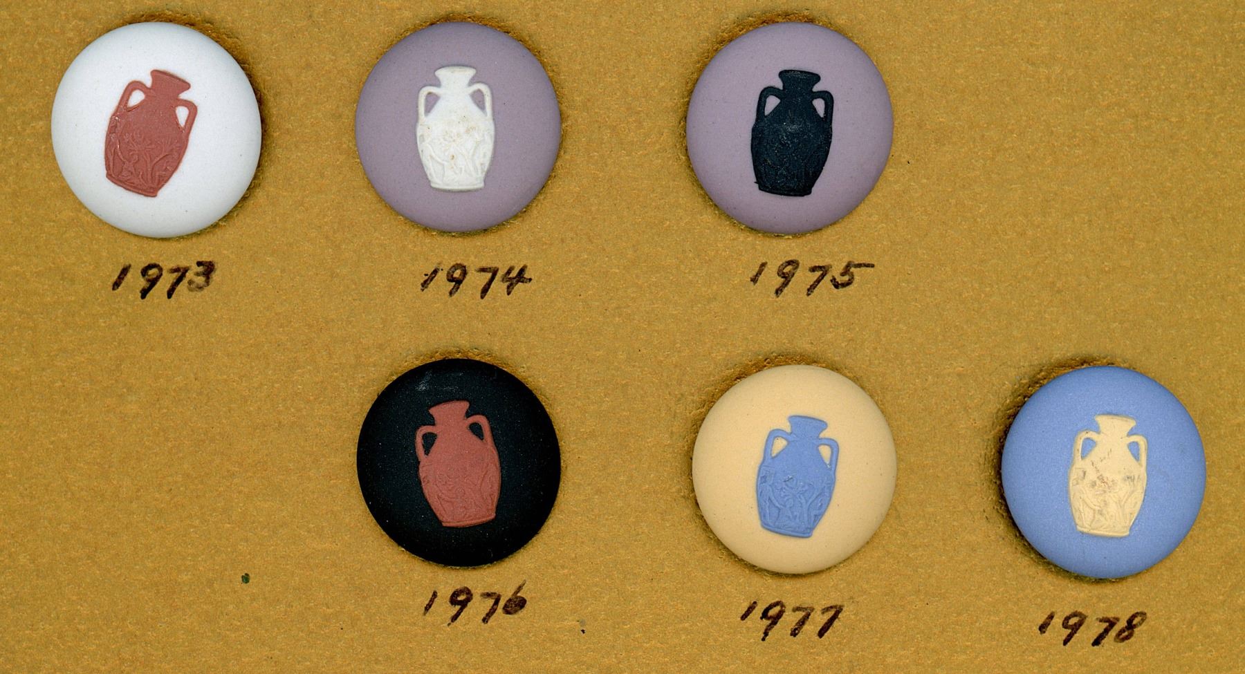 6 Medium 20th century Wedgwood seminar favor buttons. Like the button societies, the Wedgewood society gives a favor button each year of their conventions. Every year a different coloration of the same button with the famous PORTLAND vase depicted on it is produced for the attendees. Here we have 6 of those years available for bidding. There are several lots of these in this auction. The year is labeled under each button. These are the self shank examples not the studs.