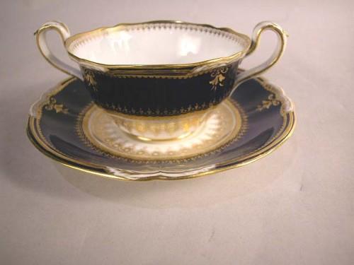 A SET OF EIGHT COPELAND, ENGLAND PORCELAIN BULLION CUPS WITH UNDERPLATES; Retailed by Gilman Collamore, New York, white with cobalt borders and gilt decoration, losses