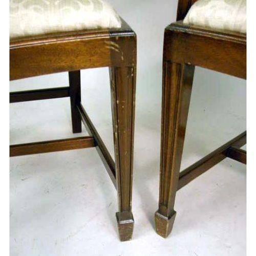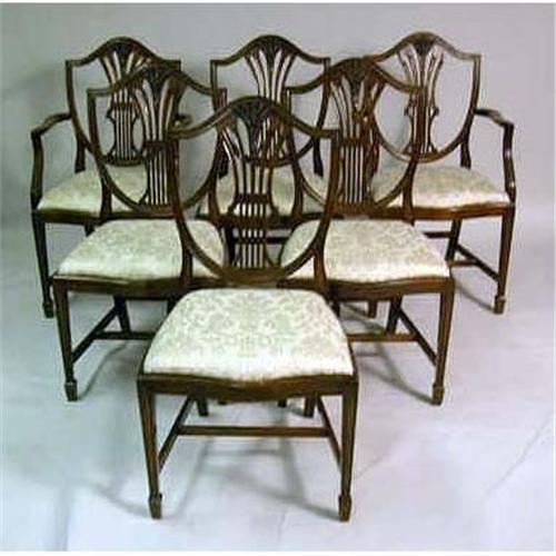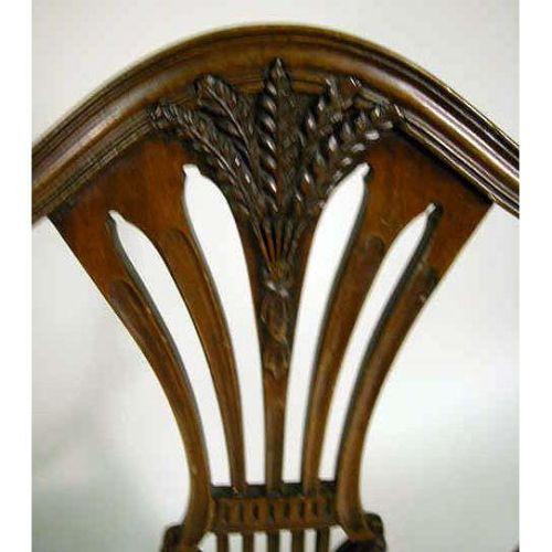 A SET OF EIGHT GEORGE III STYLE CARVED MAHOGANY SHIELD BACK DINING CHAIRS<BR><BR>In the English tradition, comprising two arm and six side chairs, 38 1/2"h