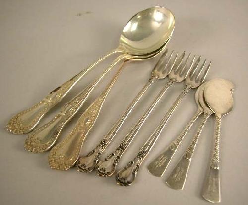 A SET OF EIGHT GORHAM STERLING SILVER SEAFOOD FORKS; Together with a set of twelve Gorham "Colonial" pattern (1885), pate knives, and five mexican sterling cream soup spoons, 7"l, total apx. 18 T.O.