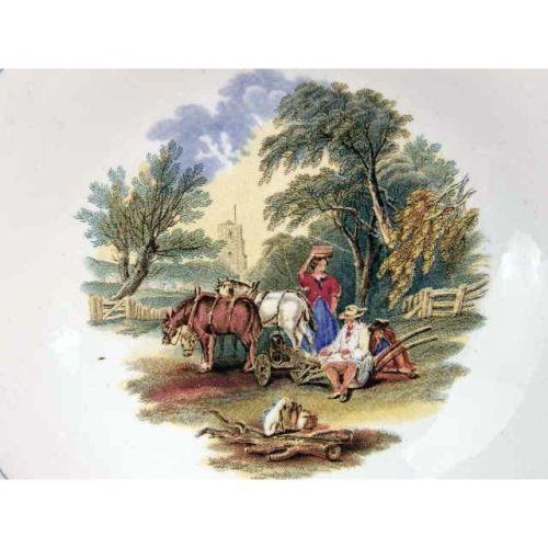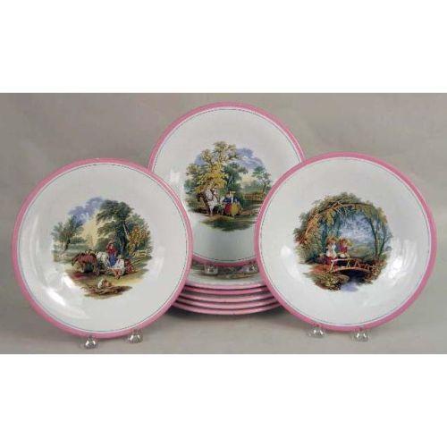 A SET OF EIGHT OPAQUE PORCELAIN LUNCHEON PLATES<BR><BR>White with pink rim, each plate depicting a different countryside scene with figures in the center, 9-1/4"dia.