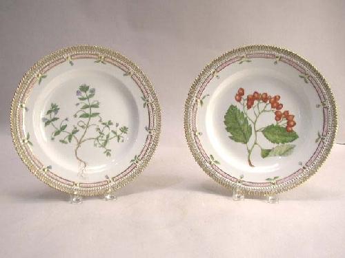 A SET OF EIGHT ROYAL COPENHAGEN "FLORA DANICA" PATTERN PORCELAIN DINNER PLATES; With gilt serrated and beaded borders, each central painted with specimen flowers, blue waves and green printed mark, #3549, 10"dia.