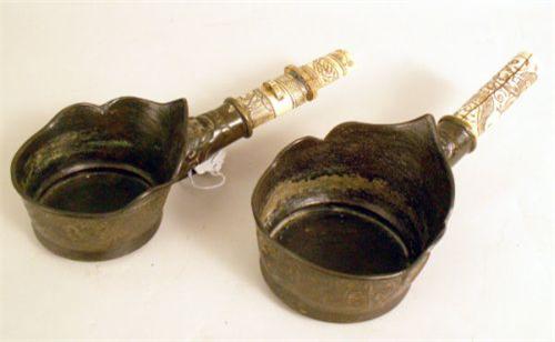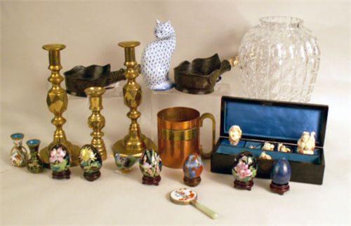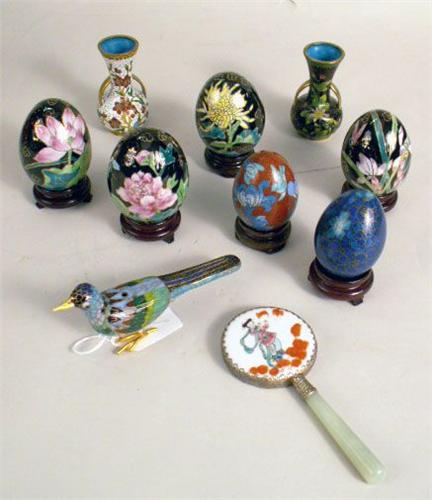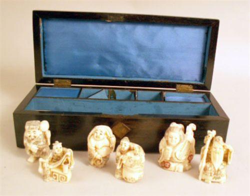 Comprising two female figures and three male figures, in a black stained wood presentation box. 3"h. Together with a group of decorative items, including a pair of Oriental ceremonial cups, a jadeite handled magnifying glass, cloisonne eggs, and a pai