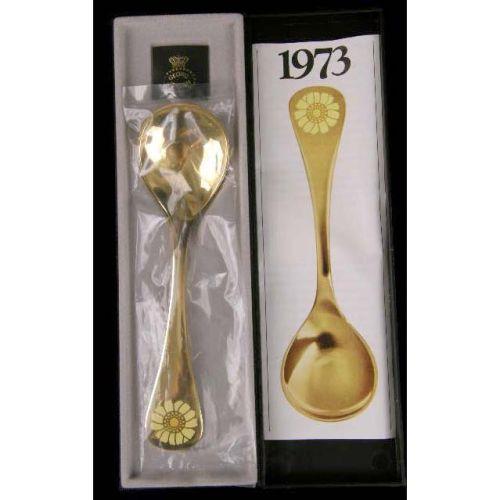 A SET OF FIVE GEORG jENSEN, DENMARK GOLD PLATED STERLING SILVER YEAR COLLECTORS SPOONS IN ORIGINAL BOXES<BR><BR>Each apx. 1 T.O.