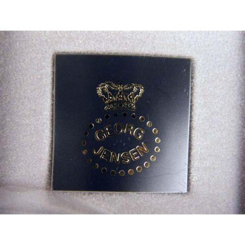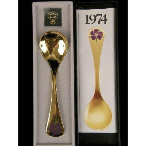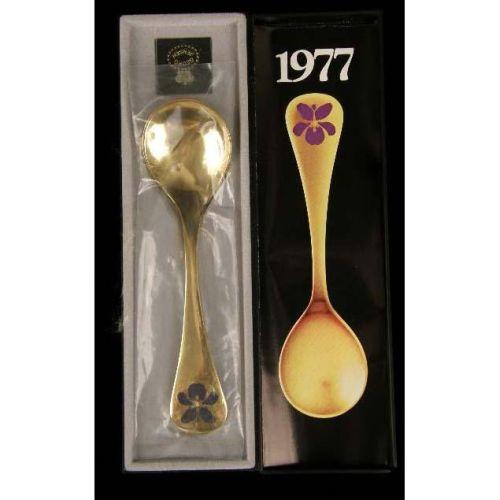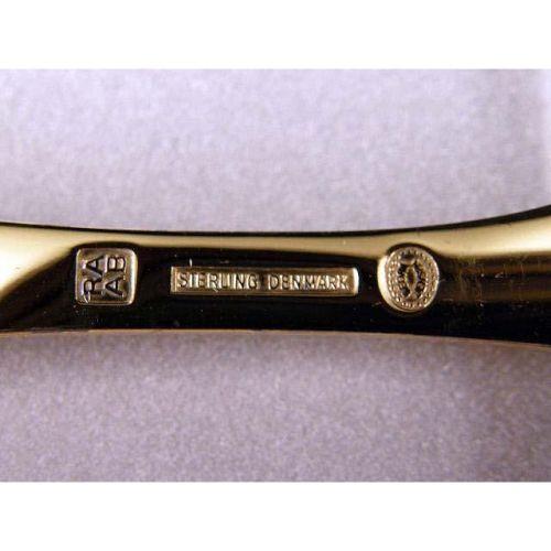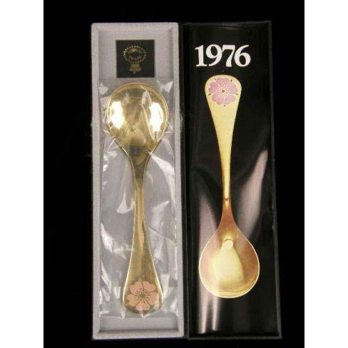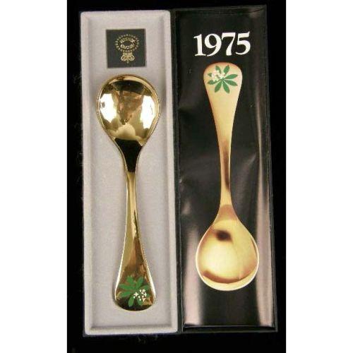 A SET OF FIVE GEORG jENSEN, DENMARK GOLD PLATED STERLING SILVER YEAR COLLECTORS SPOONS IN ORIGINAL B