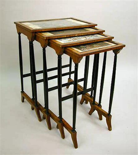A SET OF FOUR BIEDERMEIER NESTING TABLES; Rectangular shaped top resting on black lacquered supports