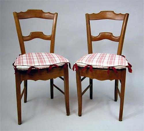 A SET OF FOUR FRENCH PROVINCIAL CHERRYWOOD SIDE CHAIRS; Each with a shaped crest, rush seats, and splayed legs (minor repairs)